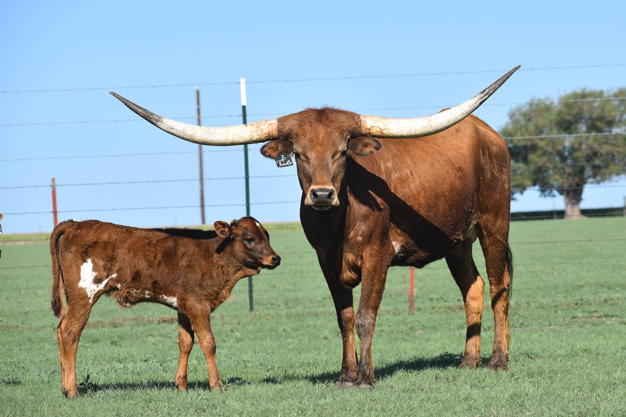 TC Trudi is a gorgeous red heifer, and as an 80" 3.5 year old she comes stacked in the genetics department as a very own 101.75" TTT Tuff Cowboy daughter and her dam is one of one of the last living Field of Pearls daughters. She's a granddaughter of 106.25" TTT Cowboy Tuff Chex and 100" TTT Miss Kitty. mix in some Cowboy Casanova and she's a genetic powerhouse for horn, color, and production. She's eat out of your hand gentle and an excellent mother as well as the half sister of our Multi Grand Champion bull, Jest a Cowboy.
