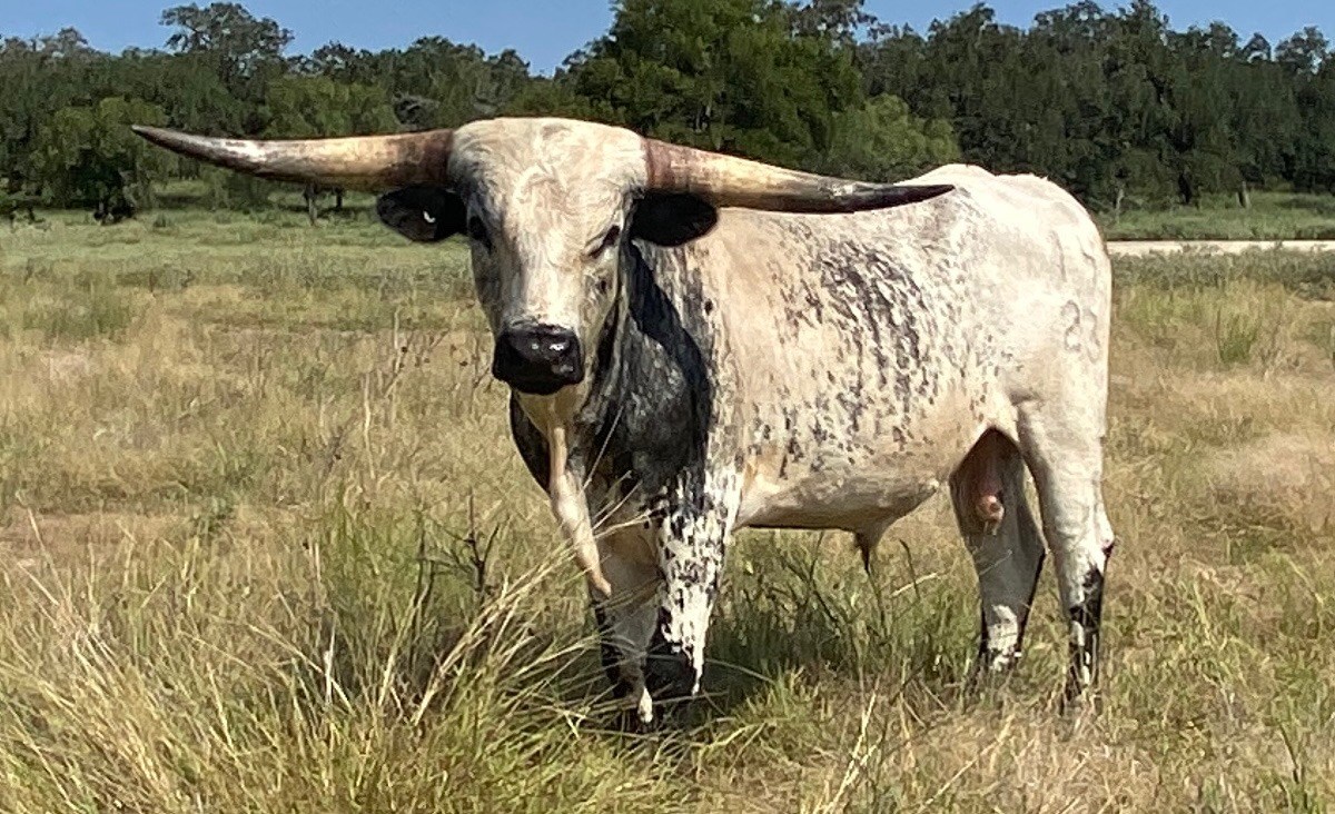 We purchased him as a 1 year old from M7 Longhorns in the summer of 2024. His sire is the one and only WS Hydro, who provides unique color patterns in most of his offspring. His dam is a tall, true black cow out of CV Cowboy Casanova & WS Midnight. His first crop of calves are hitting the ground this fall, and boy does he sure throw some crazy color!