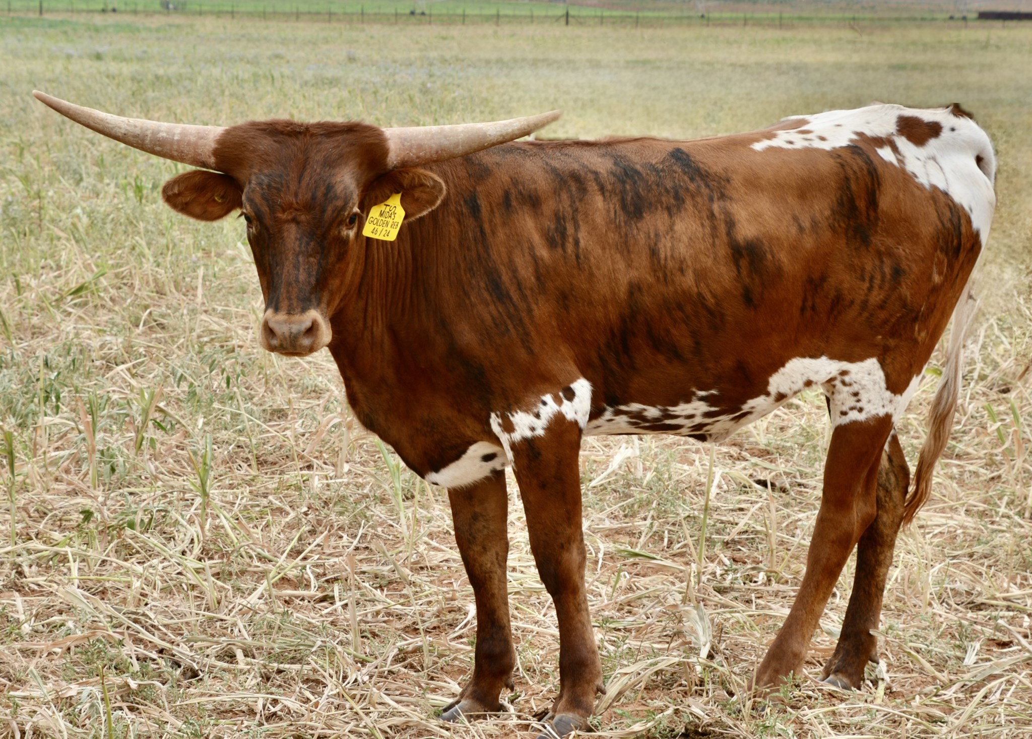 We are so excited to watch this heifer grow up and take her place in a pedigree filled with the top longhorns in the breed from the past to the present. Her sire is 102" TTT and over 111.00" TH. Her dam is 82.8750" TTT and is a Rebel HR daughter. Genetics to build a program on. Golden Reb has 21- 80's, 4-90's and 3-100's in her star studded pedigree!