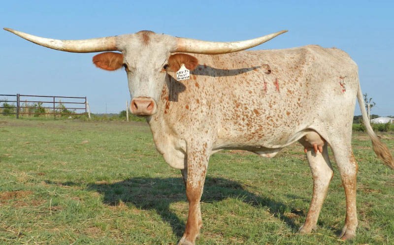 EXTREMELY COLORFUL HEIFER, CONFIRMED 3 1/2 MONTHS BRED TO HORN SHOWCASE WINNING BULL COWTOWN ST ON 3/17/11. BOTH JUST PERFECT AND COWTOWN HAVE THICK, FLAT HORNS! PROJECTS TO MID 70'S TTT