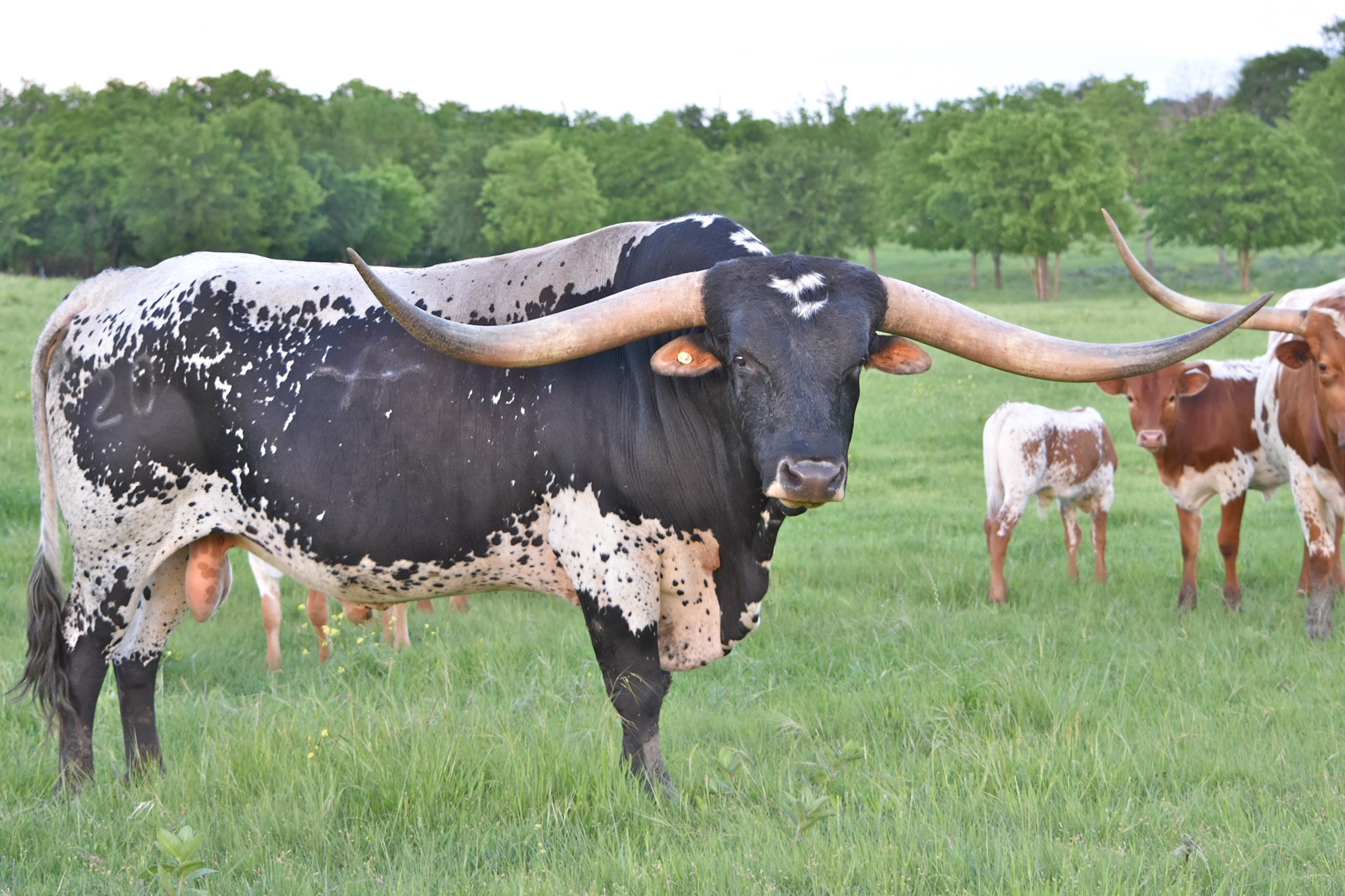 Proven production from an impeccable pedigree, 20 GAUGE continues to rock the Texas Longhorn community with complete and beautifully colored offspring that are highly desirable in every way, including early horn growth. We contribute his outstanding production to his unique and powerful maternal genetic line. In partnership and through semen sales, 20 GAUGE is being utilized in the best breeding programs in the Country with amazing results pouring in. Just look at his progeny and futurity earnings, and you will agree. Study his pedigree, and you will find multiple proven producers of horn, horn with twist, color, and conformation. In 20 GUAGE'S pedigree are some of the all-time great producing herd sires in the Industry, beginning with his sire CONCEALED WEAPON and grandsires, JP RIO GRANDE, J.R. GRAND SLAM, PEACEMAKER 44, GUNMAN, LAMBS POWER PLAY, OVERWHELMER & WATSON 83, to name a few. 20 GAUGE (2022, 2023 and 2025 BULL OF THE YEAR with over $80,000 of life-time earnings) is the highest earning bull since tracking futurity earnings began. Notably in 2025 20 G scored 12,000 points higher then the second place contender for bull of the year. An incredible record that will probably never be beaten. He is undefeated in futurities and is a former Horn Showcase Champion winning in tip-to-tip, total- and composite horn. We believe the long-term legacy of HUBBELLS 20 GAUGE, with each calf that hits the ground, will prove to be among the best producing Herd Sires in Texas Longhorn History.