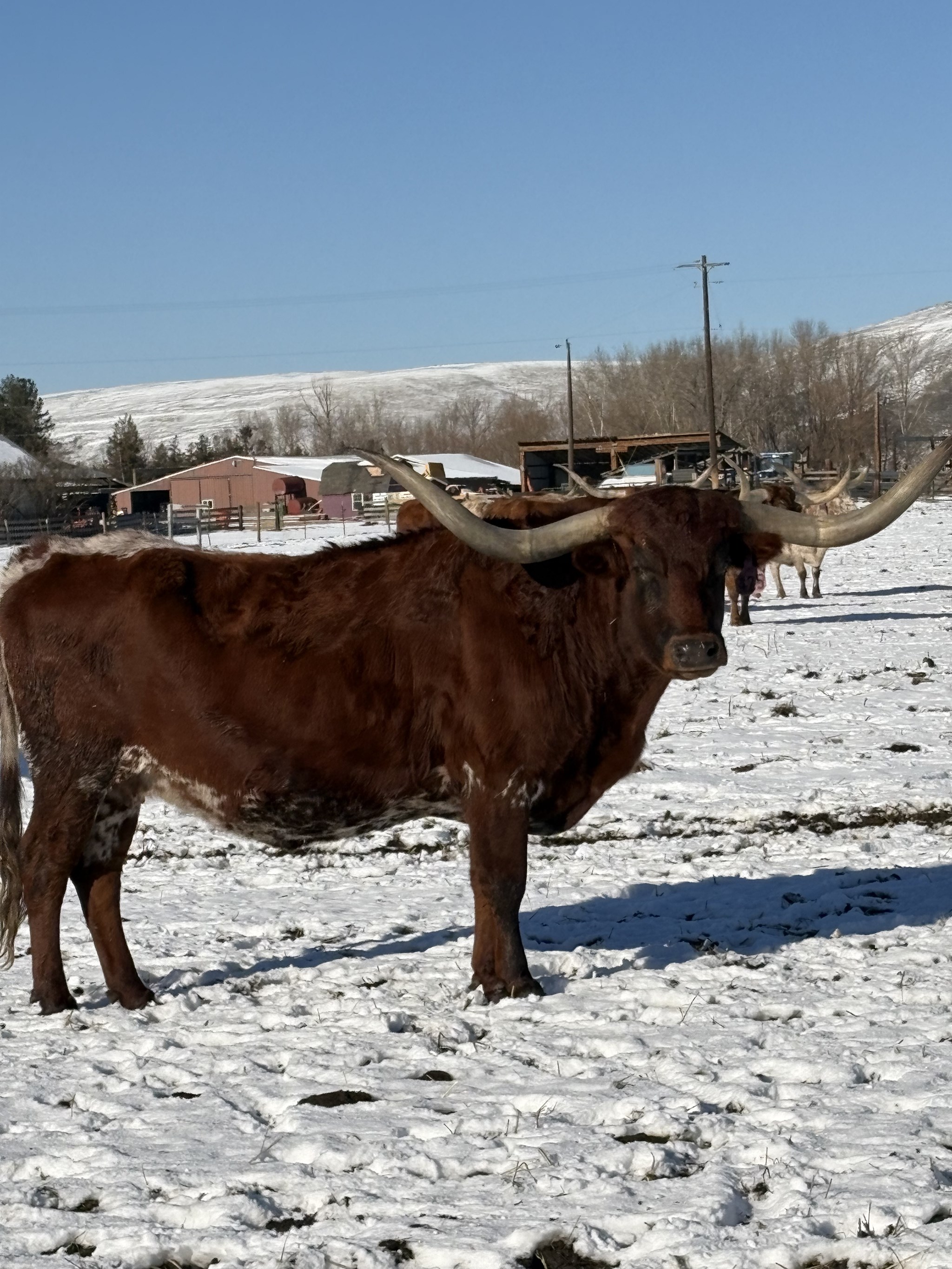 Beautiful rich red cow with rolling horns. Exposed to Hubbells Boss Hog for Spring 2022. Selling in our Online Extravaganza Sale on March 3 2022. https://auctions.herdsmanlegends.com/auctions/12951-CR-Longhorns-Extravaganza-Sale-with-Friends?page=1&search=&sort=&lotsTotal=22&pageSize=25&playSoundEnabled=true
